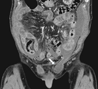 showed considerable free fluid, free air and a thickened wall of the sigma with multiple diverticula imposing as a pseudotumor without signs of an acute inflammation (Figure 2). This rose the suspicion of a traumatic sigma perforation. The left inguinal canal was fluid-filled with free air present (Figure 3). Because of the absence of an intensive care unit the patient was transported to a tertiary referral hospital for an urgent explorative laparotomy. The inspection showed a feculent 4-quadrant peritonitis with a perforation of the small bowel 50cm proximal to the ileocecal valve. The perforated small bowel was resected as a segment. A side-to-side ileostomy was formed. The sigma was indurated on palpation and suspicious of a colon cancer. In the intraoperative rectoscopy the tumor could not be reached. The inguinal canal was filled with stool and a lavage was performed together with the whole abdomen. A drainage was placed and the abdomen closed temporary with a negative-wound-pressure therapy (NWPT) system. The preoperatively started intravenous antibiotic treatment with imipenem was continued. On the first postoperative day, a rectosigmoidoscopy was unable to pass the stenosis in the sigma. A repeat CT of the abdomen with rectal and intravenous contrast showed wall thickening of the sigma with perifocal lymphadenopathy (Figure 4). In the 2nd look laparotomy 48 hours after the initial operation an anterior resection with complete mesocolic excision and partial mesorectal excision was performed because a malignant disease could not be excluded. A descendorectostomy was performed and the side-to-side ileostomy was reversed into a protective splitstoma. Again, the inguinal hernia was not touched due to the contamination. The NWPT was continued and after two NWPT changes primary fascial closure was achieved eleven days later. The histopathology showed a covered perforation of a sigma diverticulitis with inflamed pseudotumor without signs of malignancy. 22 days after the tennis accident the patient was discharged for rehabilitation. One month later he is in a good health condition and is waiting for the reversal of the stoma and definitive treatment of the inguinal hernia.