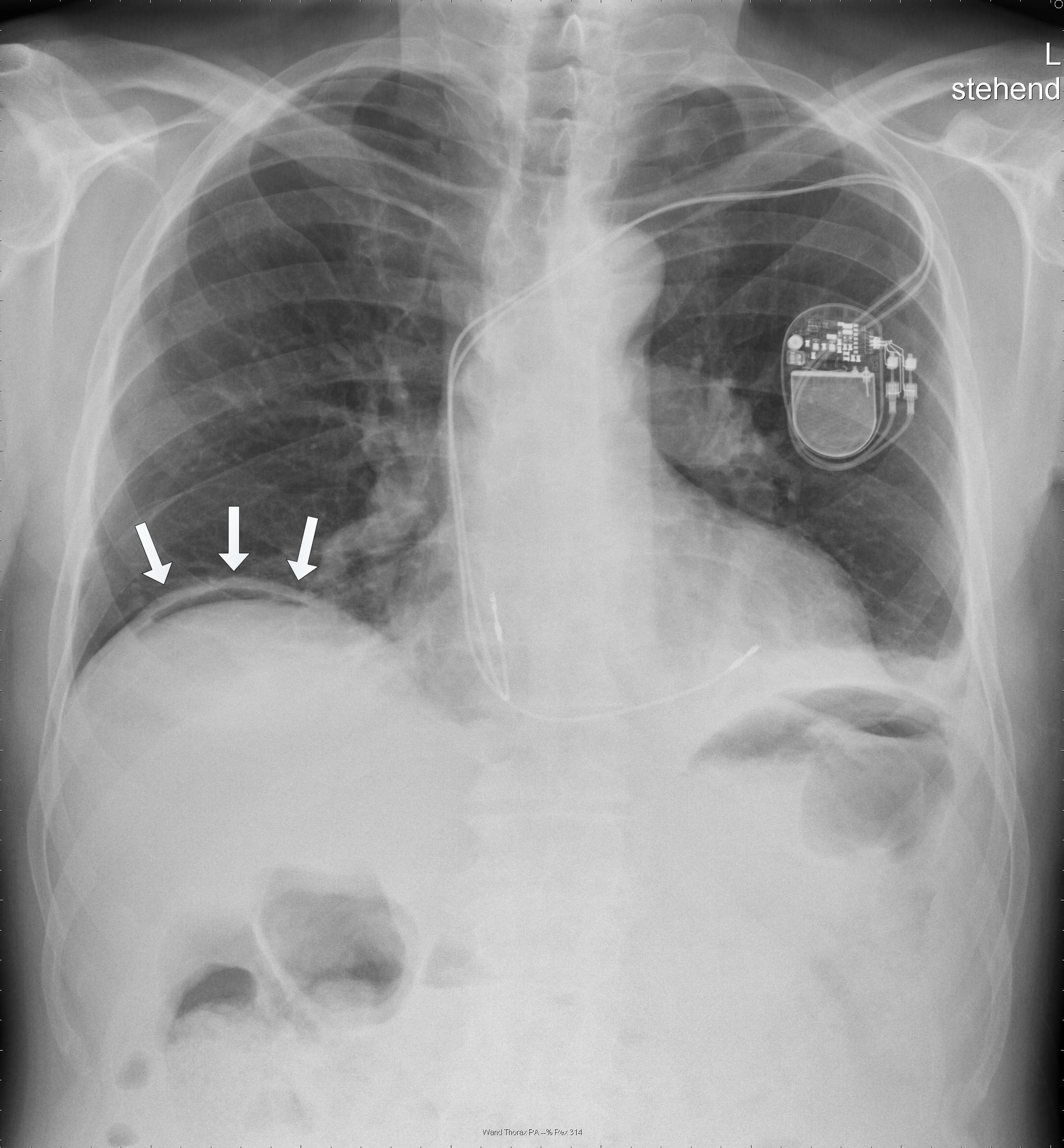 A physically fit 74-year old male with a known history of a left-sided inguinal hernia presented to our emergency department with lower abdominal pain after a fall while playing tennis. After striking the ball the patient fell forward, landed on both his hands and suffered a blunt trauma to his abdomen. He identified a swelling in the left groin and reduced the content back into the abdomen. Due to persisting pain in the lower abdomen he presented to our emergency department. The vital signs were normal and the examination showed tenderness in the lower abdomen without signs of peritonitis. No evidence of incarceration of the inguinal hernia was present. The white blood cell (WBC) count was 13’000 and the c-reactive protein was 17mg/l. The abdominal sonography showed no free fluid or air and the patient was hospitalized for analgesic treatment. Thereby the patient was free of symptoms on the following day. On the second day after the injury the condition of the patient worsened with vomiting and a ballooned abdomen. An erect x-ray of the chest showed free intraabdominal air (Figure 1). The labs showed a WBC count of 6’000, a c-reactive protein of 463mg/l, a creatinine of 136umol/l and normal liver enzymes and lipase. The computed tomography (CT) of the chest and abdomen with intravenous contrast